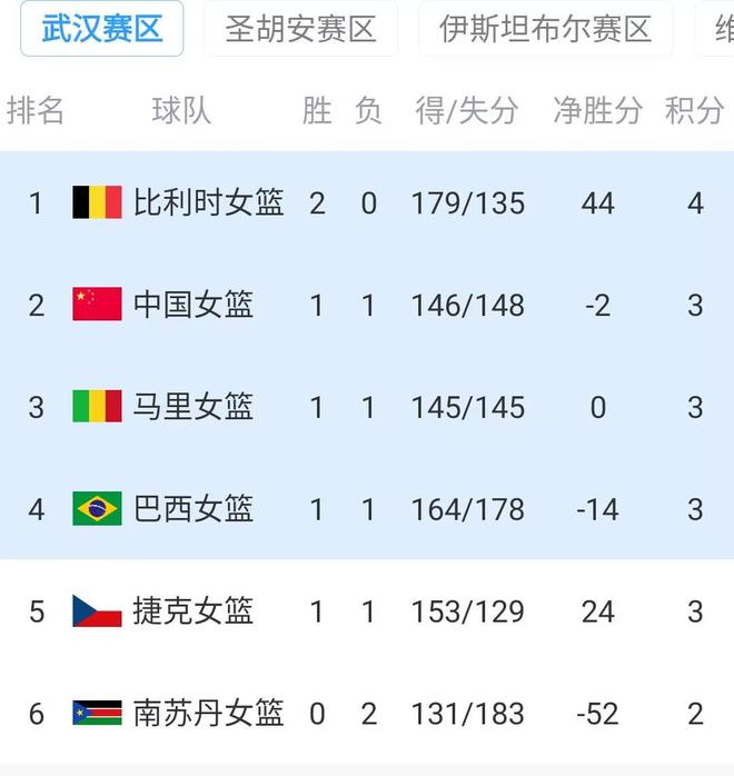 结束这一场比赛后,女篮所处的A组最新积分形势也出来了,2战全胜的比利时高居榜首,中国队、马里、巴西、捷克都是1胜1负积3分,分列第2-第5,中国队净胜分-2,凭借上一轮击败马里的优势以及本轮捷克爆冷输球,排名不降反升来到第二。
