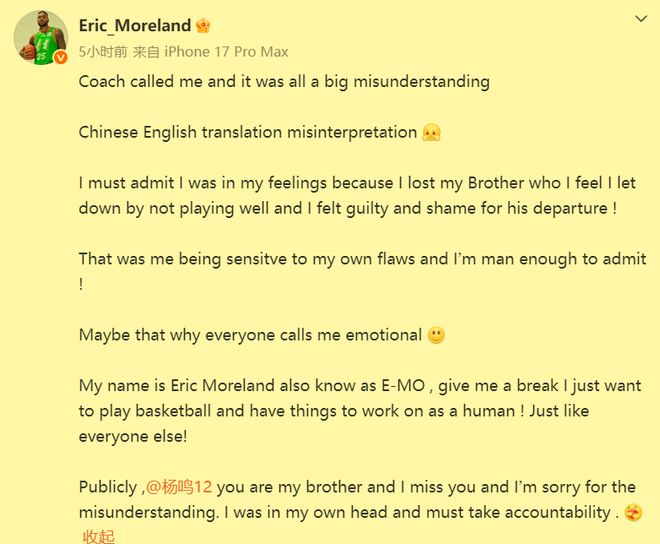然而没有料到的是,看上去大大咧咧的莫兰德,在看了杨鸣对他的评价后,当天晚上躺在床上翻来覆去却怎么也睡不着。于是,他就在凌晨一点多发了一条动态回应这件事。主要想表达的是,对于杨鸣在第一阶段执教辽篮期间,他对于自己的表现时好时坏而感到愧疚。因为他觉得自己CBA生涯的最大恩人杨鸣的突然辞职,跟他不够稳定的比赛状态不无关系。