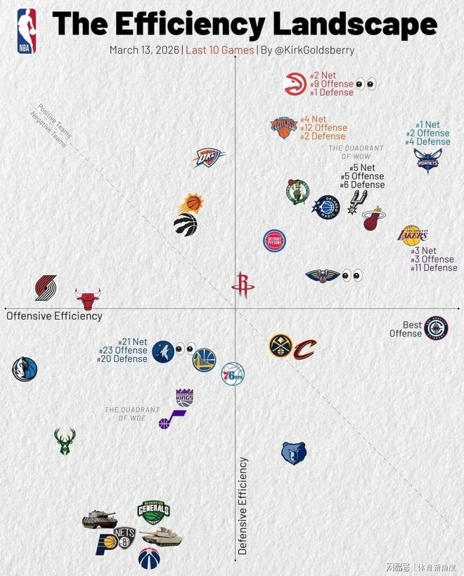 观察最近10场比赛的攻防效率图,不难发现湖人队已然成为攻防兼备的强队。他们的进攻效率位列第三,防守效率也跻身前11,净效率更是高居联盟第三。尽管湖人队接下来的赛程略显艰难,但球迷们仍期待他们能够保持当前状态,为季后赛做好充分准备。