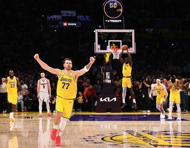 这个时候湖人并未选择换上海斯提升高度,里夫斯精准判断出球的落点,随后拿到进攻篮板后直接选择突入篮下,抛投得手将比分神奇扳平。全场球迷狂欢庆祝,这个时候势头已经来到湖人这边,到了加时赛虽说掘金几次扳平比分,但湖人总是能够做出回应,最后时刻东契奇也是完成了准绝杀,让湖人主场彻底沸腾。