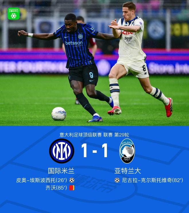 北京时间3月14日意大利足球甲级联赛第29轮,国际米兰主场迎战亚特兰大。比赛中,国际米兰球员完成助攻,皮奥-埃斯波西托率先破门;随后亚特兰大的尼古拉-克尔斯托维奇打入一球扳平比分;比赛尾声阶段,国际米兰一名球员吃到第二张黄牌。最终双方战成1-1平。