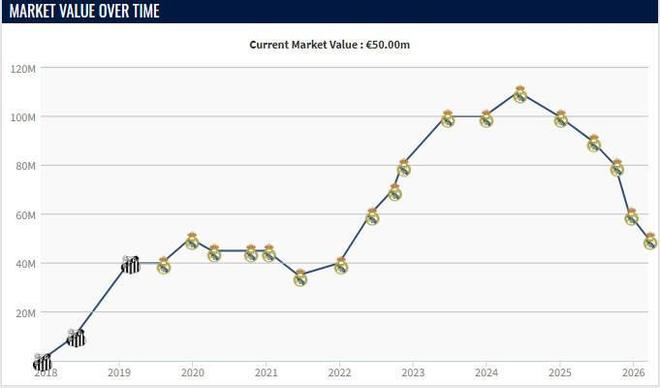 但在姆巴佩加盟球队之后,罗德里戈在球队中的重要性下降,上赛季开始,他的身价开始下滑,2024年12月跌至1亿欧元,2025年6月跌至9000万欧元,10月下降至8000万欧元,12月跌至6000万欧元,而今年3月则下降至5000万欧元。