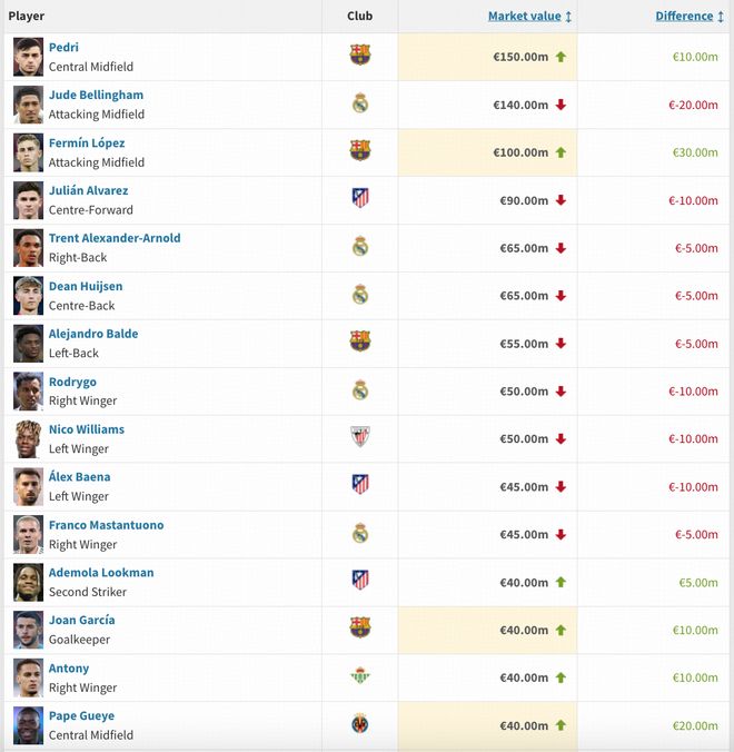 西甲身价跌幅榜:贝林厄姆跌2000万欧居首,罗德里戈、加维、小蜘蛛跌1000万欧