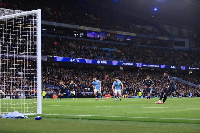 急于追分的曼城在比赛哨声响起后立马展开进攻,前5分钟时间,库尔图瓦便分别扑出了多库和罗德里的射门;而阿韦罗亚也极其务实的快速反击战术在抗住曼城开场后的攻势后也收到了效果。第22分钟,巴尔韦德刚过中线后送出贴地直塞,维尼修斯个人能力突破内切晃开胡桑诺夫后劲射击中了立柱反弹,迪亚斯回敲,维尼跟进再补一脚,B席门线前用手臂将球挡出;主裁判蒂尔潘观看VAR后不仅吹罚点球,还直接红牌罚下了B席;维尼修斯没有重蹈首回合的覆辙,点球稳稳命中,1:0,总比分4:0!值得一提的是,在阿韦洛亚执教皇家马德里之后,维尼修斯在各项赛事中出场15次打入8球;而在阿隆索执教阶段,他在33场比赛中仅打入7球。