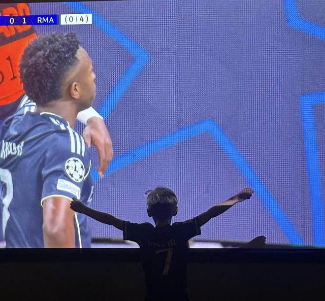 皇马名宿加雷斯-贝尔也是带着儿子守在电视机前一同观赛,并在社交媒体晒出了自己儿子身穿维尼修斯球衣庆祝其进球的照片。