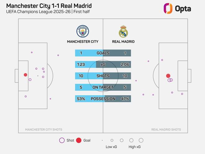 根据Opta的统计,本场比赛前45分钟皇马10次射门5次射正,预期进球数达到了2.06球,这是自2013-14赛季开始进行相关统计以来,皇马在欧冠淘汰赛单场比赛中最高的上半场预期进球数。