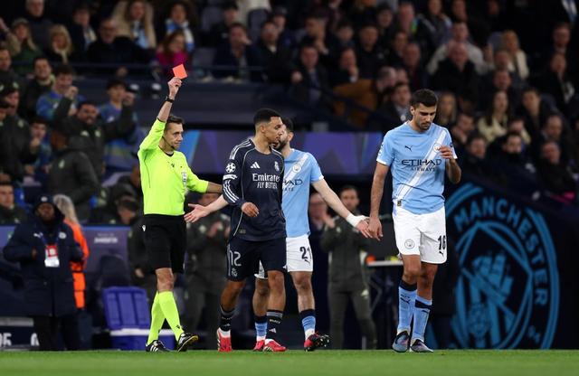 带着首回合0-3的巨坑回到主场,曼城本来就压力山大。结果比赛才踢了20分钟,B席在禁区内一肘挡出了维尼修斯的必进球。VAR明察秋毫,法国名哨蒂尔潘没有丝毫手软,直接掏出红牌将他罚下。这可是31岁的B席职业生涯第一次染红!