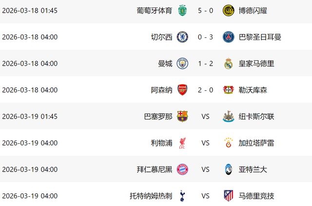 北京时间3月18日,欧冠16强淘汰赛第二回合进行了4场比赛,结果阿森纳、大巴黎、皇马和葡萄牙体育分别战胜各自的对手,顺利晋级8强。