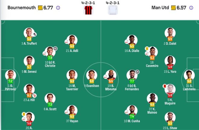 曼联首发:31-拉门斯、2-达洛特、15-约罗、5-马奎尔、23-卢克-肖、37-梅努、8-B费、18-卡塞米罗(82'25-乌加特)、16-迪亚洛(96'7-芒特)、10-库尼亚(82'26-海文)、19-姆伯莫(71'30-谢什科)