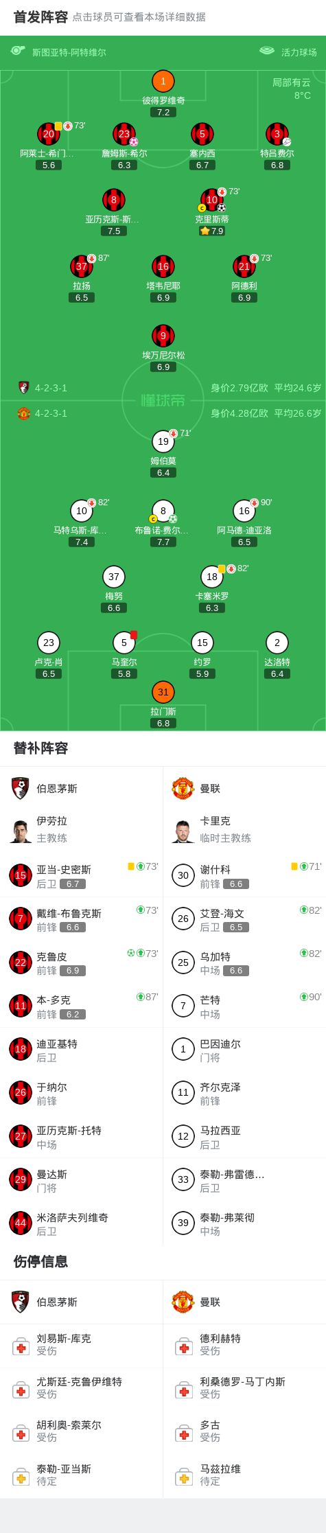 北京时间3月21日英格兰足球顶级联赛 联赛 第31轮,伯恩茅斯主场对阵曼联。伯恩茅斯克里斯蒂破门,克鲁皮破门,詹姆斯-希尔自摆乌龙。曼联布鲁诺-费尔南德斯破门。最终比分伯恩茅斯 2-2 曼联。