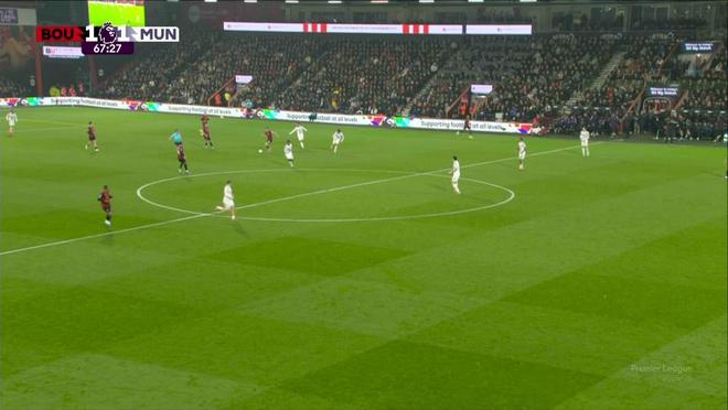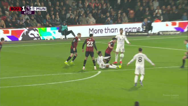 当时,1-0领先的曼联攻入伯恩茅斯禁区,布鲁诺·费尔南德斯妙传阿马德·迪亚洛,后者顺势带入禁区,在阿德里安·特鲁弗尔又拉又推之下倒地了。主裁斯图尔特·阿特维尔没有吹犯规,伯恩茅斯得球反击,并且取得进球。