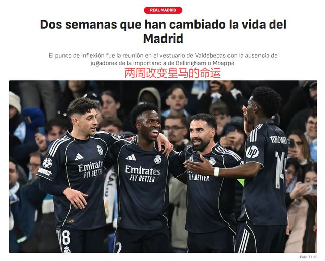 欧冠1/8决赛淘汰曼城,西甲紧追巴萨,皇马又回到正确的轨道上。3月21日,《阿斯报》撰文指出,过去15天,对皇马而言是命运逆转的关键时期。在贝林厄姆、姆巴佩缺席的情况下,皇马主帅阿韦洛亚带队逆转颓势。