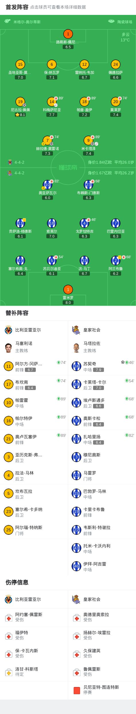 北京时间3月21日西班牙足球甲级联赛 联赛 第29轮,比利亚雷亚尔主场对阵皇家社会。比利亚雷亚尔赫拉德-莫雷诺破门,米卡塔泽破门,尼古拉-佩佩破门。皇家社会苏契奇破门。最终比分比利亚雷亚尔 3-1 皇家社会。