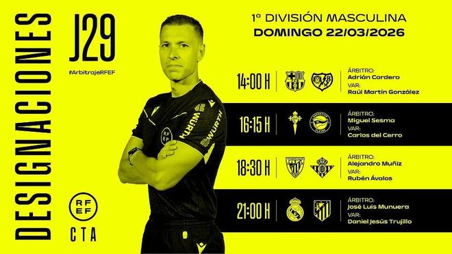 官方消息,何塞-穆努埃拉将执法西甲第29轮皇马vs马竞的马德里德比。