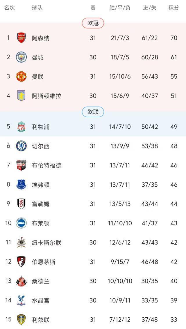 不过对于红蓝两军而言,倒也并非一切都是坏消息,比如比他们排名更靠前的维拉就也有在联赛支撑不住的感觉,本轮之前就已经英超四轮不胜兼三连败。如果眼看着争五优势不保,维拉主帅埃梅里或许还会把更多注意力放到欧联杯。而英超赛程也颇为有趣,下一轮(第32轮)就有布伦特福德主场对埃弗顿,有种“谁赢了谁就去挑战前五”的感觉。若是平局两败俱伤,则自有渔翁得利。