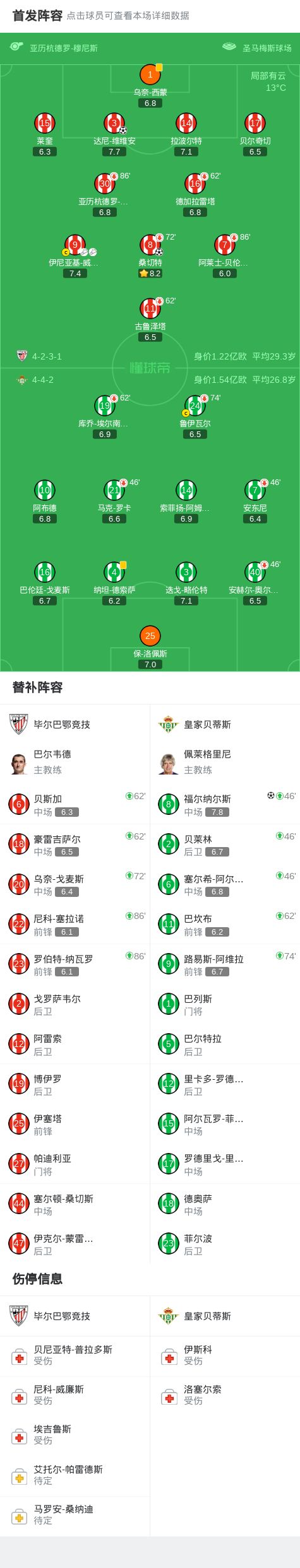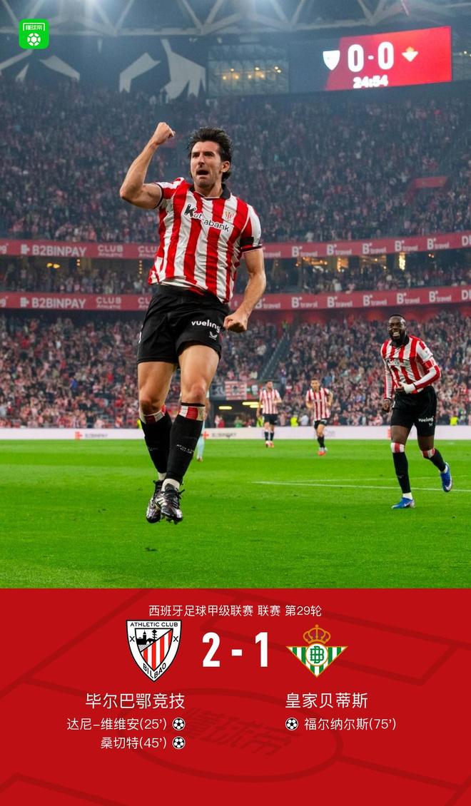 北京时间3月23日西班牙足球甲级联赛 联赛 第29轮,毕尔巴鄂竞技主场对阵皇家贝蒂斯。毕尔巴鄂竞技达尼-维维安破门,桑切特破门。皇家贝蒂斯福尔纳尔斯破门。最终比分毕尔巴鄂竞技 2-1 皇家贝蒂斯。