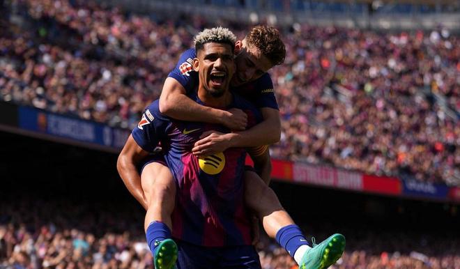 随后经过简单的适应之后,巴塞罗那很快找到进攻感觉,亚马尔边路吸引多人防守,拉菲尼亚数次获得良机,单刀打偏、远射击中横梁!直到第24分钟,坎塞洛角球罚到禁区,阿劳霍如同泰山压顶一般,直接将球顶进球门,1:0!