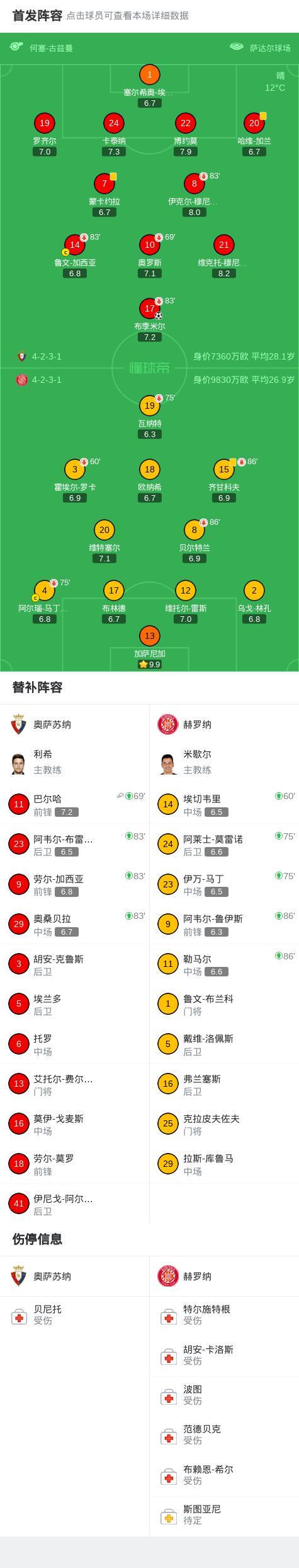北京时间3月22日西班牙足球甲级联赛 联赛 第29轮,奥萨苏纳主场对阵赫罗纳。奥萨苏纳布季米尔破门。最终比分奥萨苏纳 1-0 赫罗纳。