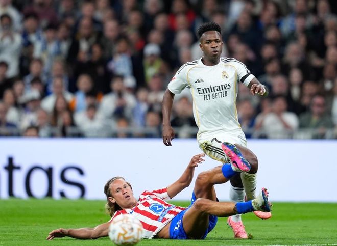 比赛刚刚开始不久,皇马就创造出好机会。卡瓦哈尔在禁区外起脚远射。门将把球扑了出去。第9分钟,巴尔韦德突入禁区右侧,起脚低射,打远角,结果皮球击中立柱弹了出去。随后,略伦特在禁区内的射门被门将神勇化解。第21分钟,维尼修斯错失良机,他的近距离射门被门线前的小西蒙尼挡出。