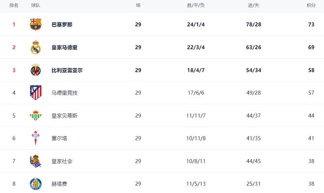 在积分榜上,巴萨依然占据榜首位置,拿到73分。皇马险胜之后紧随其后,拿到69分,依然是落后4分。冠军的争夺非常激烈。比利亚雷亚尔以58分排名第3。马竞输球,依然是57分,排名第4。皇家贝蒂斯以44分排名第5。塞尔塔拿到41分,排名第6。