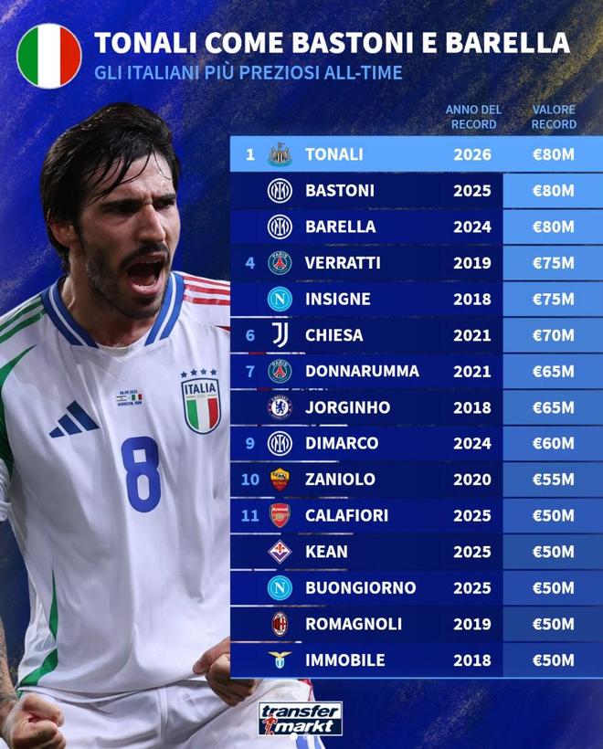北京时间3月27日,在世预赛欧洲区附加赛半决赛中,托纳利贡献的一射一传帮助意大利2-0淘汰北爱尔兰,赛后德转统计出了意大利球员历史身价榜,托纳利与巴斯托尼、巴雷拉同以8000万欧元并列第一。