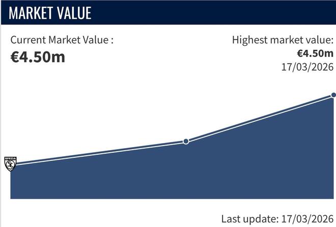科莫托的快速成长也让他的身价水涨船高,去年12月时,德转给出的评估身价为250万欧元,而到了今年3月,他的身价已经上涨到450万欧元。虽然这一价格并没有多惊艳,但他是意乙迄今为止唯一1位能够在如此短时间内身价显著增长的18岁以下球员。