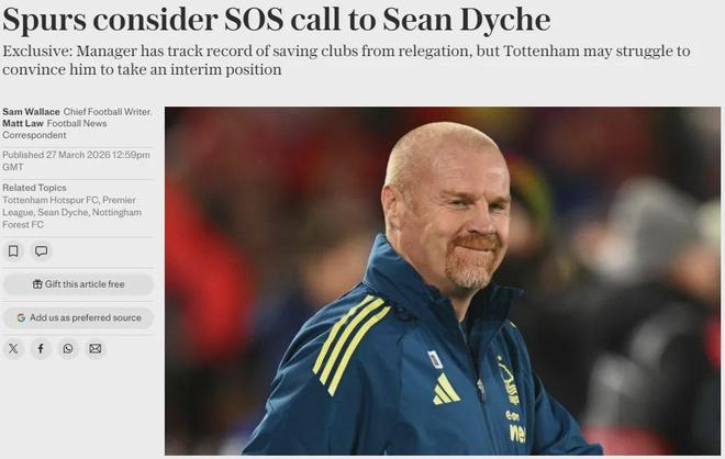电讯报主编SW和记者ML联合发文表示,热刺正考虑任命肖恩-戴彻为救火教练,以帮助他们免于降级。