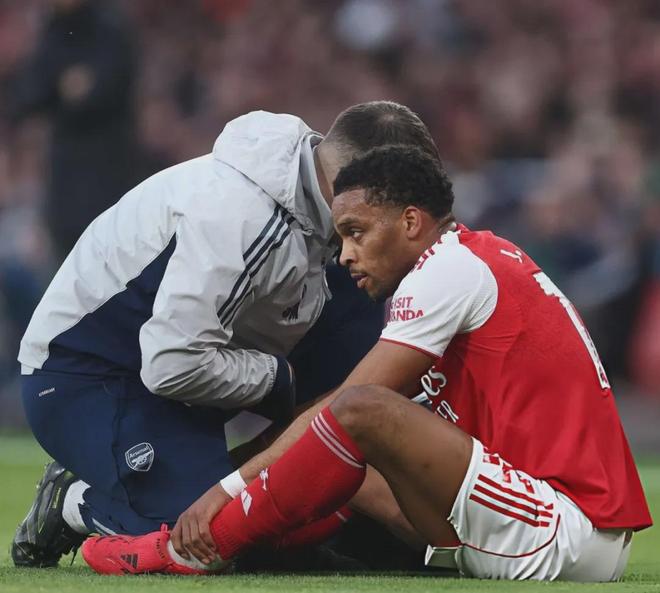 赛后阿森纳边锋被拍到左腿戴着护具一瘸一拐走过了混采区。