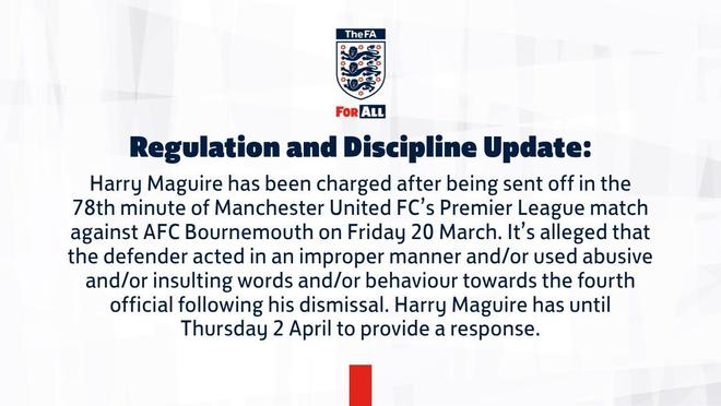 北京时间4月1日,英足总官方发布公告,曼联球员马奎尔因在3月20日曼联对阵伯恩茅斯的英超比赛第78分钟被罚下后,对第四官员存在不当行为,已被正式提起指控。