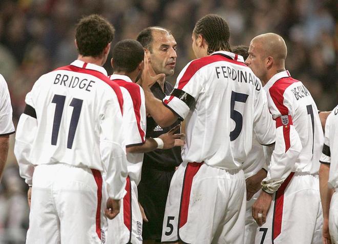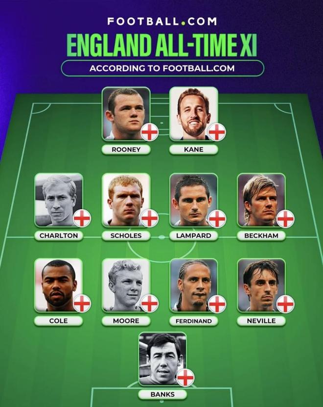 说实话,单看这份首发的简历,确实吓人。锋线上,鲁尼120场53球,凯恩112场78球,这已经是英格兰队史射手榜的前两名了。中场更是星光熠熠:查尔顿106场49球,兰帕德106场29球,贝克汉姆115场17球,连出场最少的斯科尔斯也有66场14球。