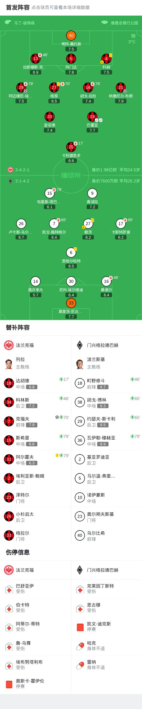 北京时间2月14日德国足球顶级联赛 联赛 第22轮,法兰克福主场对阵门兴格拉德巴赫。法兰克福纳撒尼尔-布朗破门,阿迈穆尼-埃奇古亚布破门,克瑙夫破门。最终比分法兰克福 3-0 门兴格拉德巴赫。