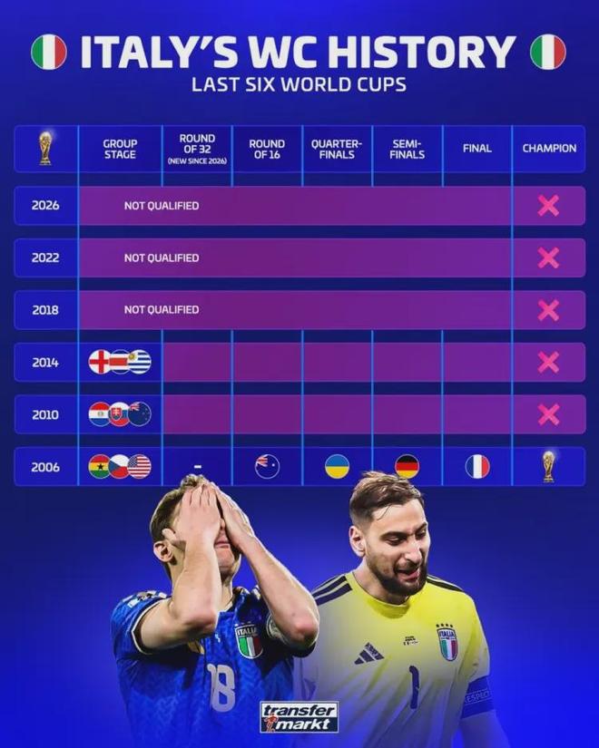 最刺目的反差,莫过于“豪华阵容”与“耻辱战绩”的割裂。德国转会市场数据显示,意大利国家队总身价高达8.34亿欧元,稳居无缘世界杯球队榜首,是第二名丹麦的两倍还多,更是苦主波黑的数倍之多。手握如此顶配阵容,坐拥意甲诸强的人才底蕴,意大利却从2006年的世界杯巅峰一路滑坡:2010、2014年小组出局,2018、2022、2026年连续三届折戟预选赛,12年与世界杯正赛绝缘,四星荣光彻底沦为过往云烟。更具讽刺意味的是,世界排名第12位的他们,甚至不如排名80名开外的库拉索、新西兰能站上世界杯赛场,这份落差的背后,是意大利足球整个体系的全面崩塌。