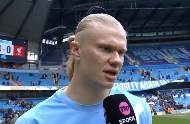 足总杯1/4决赛,曼城主场4-0大胜利物浦,赛后,此役上演帽子戏法的哈兰德接受了TNT体育的采访。