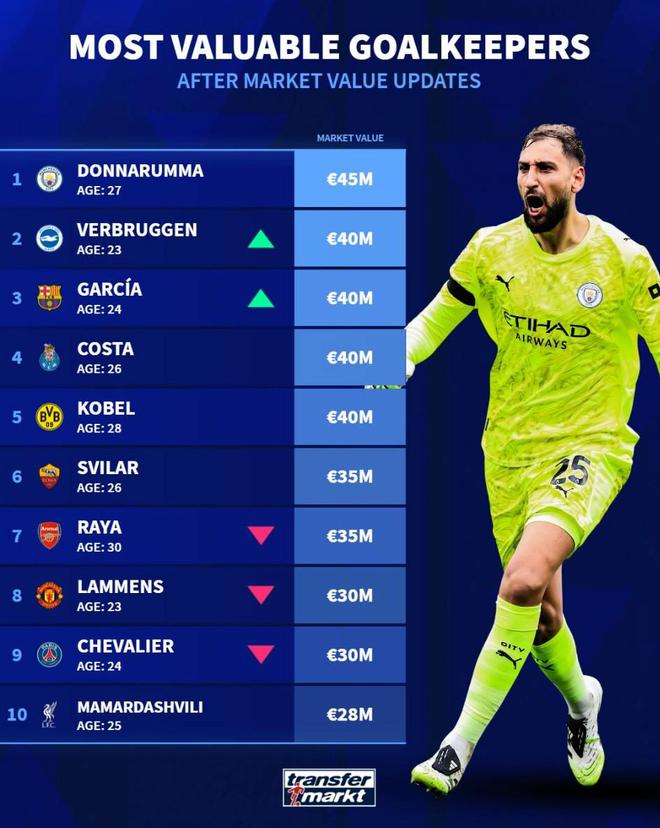 北京时间4月5日,在更新了欧洲五大联赛球员的身价之后,德转列出了目前世界足坛身价排名前十的门将,多纳鲁马虽然未能帮助意大利晋级世界杯,但他仍以4500万欧元的身价位列世界足坛门将的第一位。