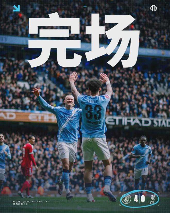 4月4日,足总杯1/4决赛,伊蒂哈德球场。曼城4-0利物浦,哈兰德帽子戏法,赛季三杀。