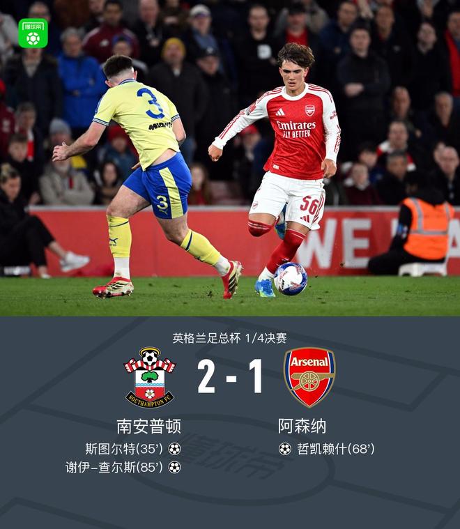 北京时间4月5日英格兰足总杯 1/4决赛,南安普顿对阵阿森纳。上半场,本-怀特出现冒顶失误,斯图尔特破门。下半场,哈弗茨助攻,哲凯赖什扳平比分。比赛尾声阶段,查尔斯建功。全场比赛结束,阿森纳1-2不敌南安普顿,无缘足总杯四强。