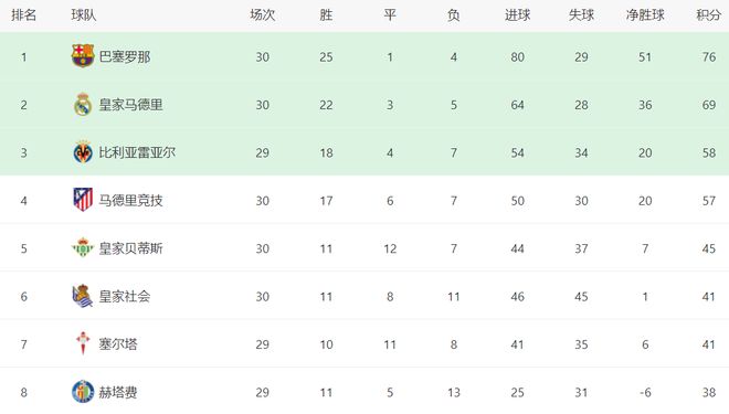 在积分榜上,赢球的巴萨继续巩固榜首位置,76分领跑,战绩是25胜1平4负。爆冷落败的皇马依然是69分,排名第2。前2相差了7分,皇马的争冠形势迅速恶化。比利亚雷亚尔以58分排名第3。第4的则是输球的马竞,拿到57分。皇家贝蒂斯以45分排名第5。皇家社会41分排名第6。