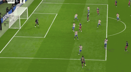 第87分钟,坎塞洛上演精彩的过人秀,之后的射门被穆索扑出,替补出场的莱万反应不及,皮球砸在他的胸口,弹进球门。