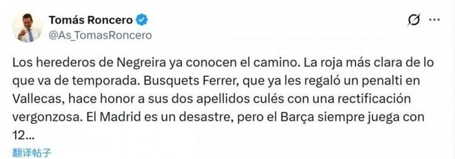 而皇马名记龙赛罗自然也发文炮轰:“这是本赛季至今最明显的红牌。一次可耻的改判,皇马表现确实糟糕,但巴萨永远是12人作战。”