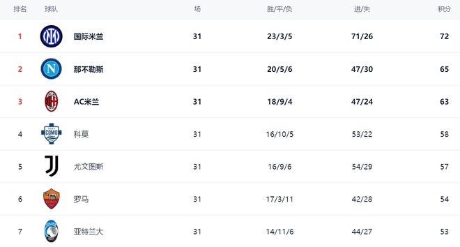 在积分榜上,国际米兰排名第1,战绩是23胜3平5负,拿到72分,遥遥领先。第2名的那不勒斯是65分,落后国际米兰7分。输球的AC米兰依然是63分,掉到第3名,落后国际米兰9分,争冠希望渺茫。科莫以58分排名第4。尤文图斯赢球之后,总积分达到57分,排名第5,距离欧冠区只有1分。罗马以54分排名第6。亚特兰大则是53分,排名第7。