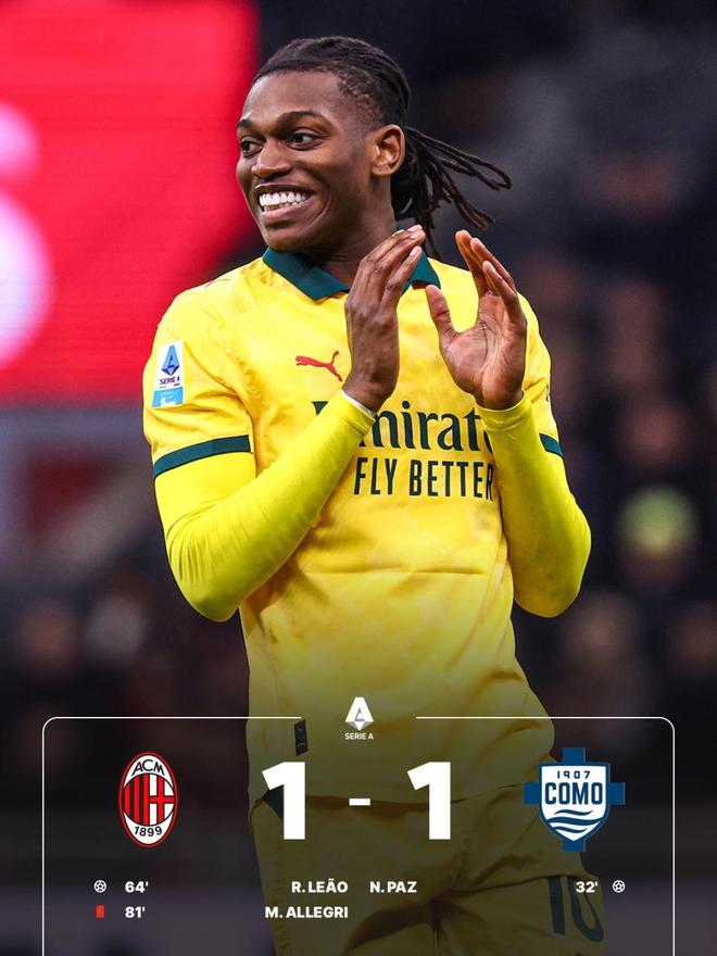 第70分钟,福法纳头球顶高;随后莱奥近距离头球击中横梁弹出。短短几分钟,两次黄金机会擦肩而过。科莫则稳守反击,节奏被压得极低,最终比分定格在1-1,米兰又丢分了!