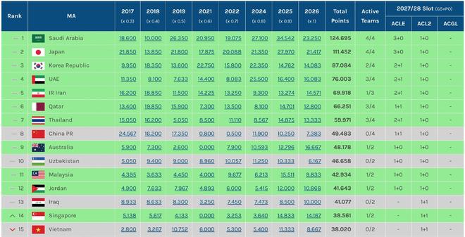 本赛季亚足联积分:中超排名第15,不及新马泰、印尼、越南