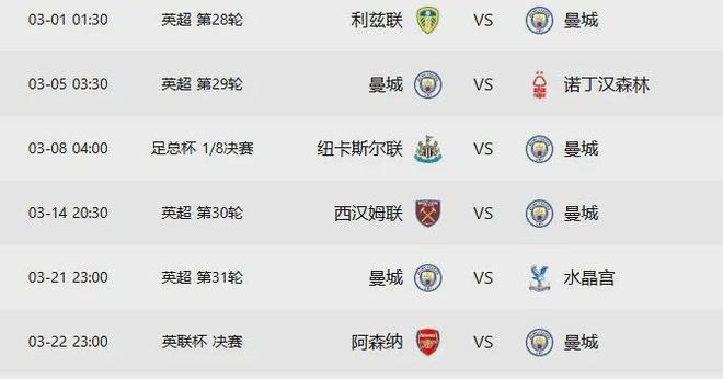 曼城未来6轮对手:利兹联(15)、诺丁汉森林(17)、西汉姆(18)、水晶宫(14)、切尔西(4)、阿森纳(1)。