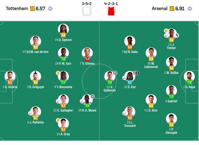 热刺首发:1-维卡里奥、37-范德芬、24-斯彭斯、3-德勒古欣、6-帕利尼亚(82’11-特尔)、8-比苏马、14-阿奇·格雷、29-萨尔、22-加拉格尔(62’19-索兰克)、7-哈维·西蒙斯、39-穆阿尼(68’9-里沙利松)。