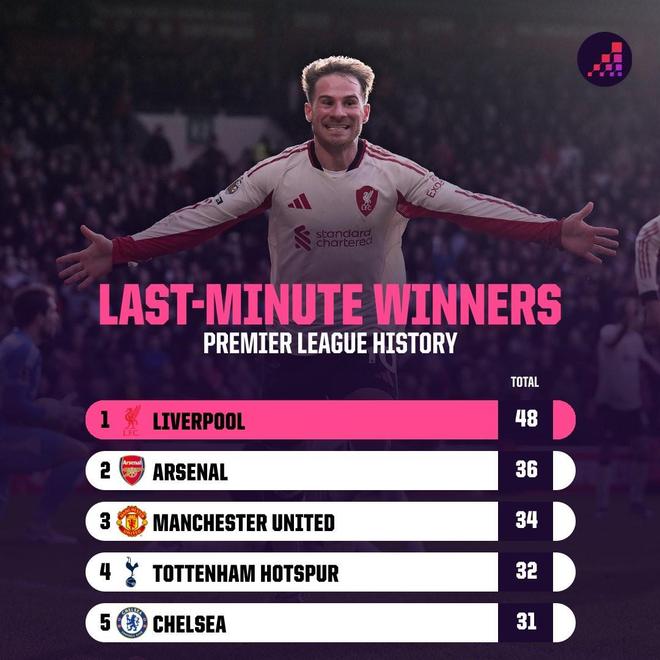 英超第90分钟后制胜球榜:利物浦48次居首,阿森纳36次第二