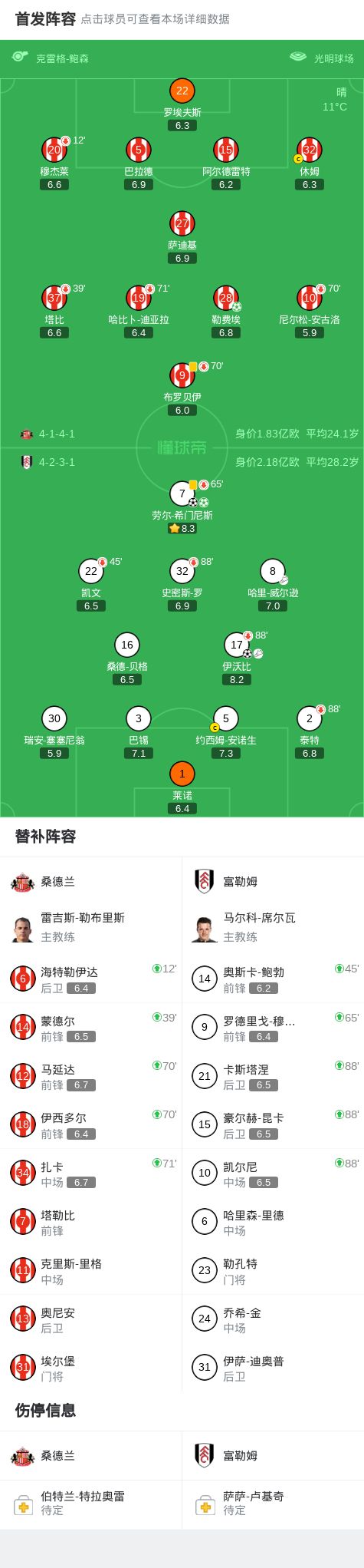 桑德兰vs富勒姆:穆杰莱、布罗贝伊首发,劳尔-希门尼斯、史密斯-罗出战