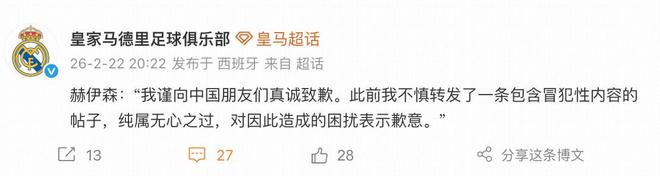 2月22日晚,皇家马德里俱乐部官方微博发布了赫伊森就转发辱华社媒事件的道歉。