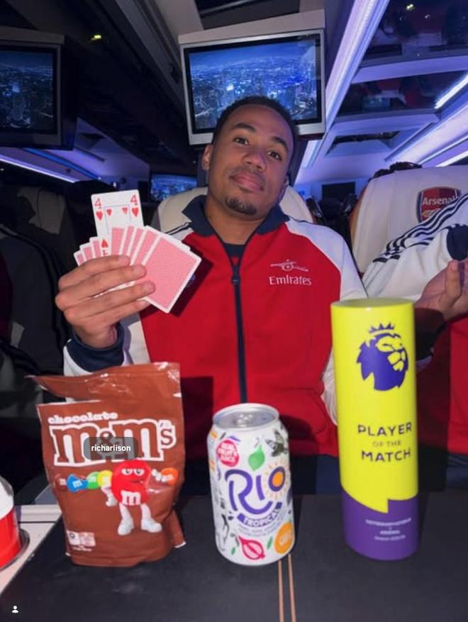 赛后,加布里埃尔晒出他在球队大巴上的照片,照片中前方放着英超官方全场最佳球员奖杯,这位阿森纳后卫手里还拿着扑克牌,并特意亮出了红桃4(可能代表他最近4次英超北伦敦德比出场都当选全场最佳)。