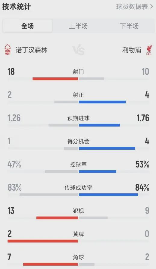 数据不会说谎:森林射门18-10,预期进球1.26-1.76,绝对机会1-4。