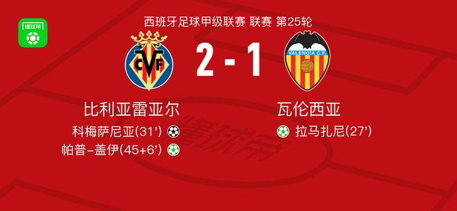 北京时间2月23日西班牙足球甲级联赛 联赛 第25轮,比利亚雷亚尔主场对阵瓦伦西亚。比利亚雷亚尔科梅萨尼亚破门,帕普-盖伊破门。瓦伦西亚拉马扎尼破门。最终比分比利亚雷亚尔 2-1 瓦伦西亚。
